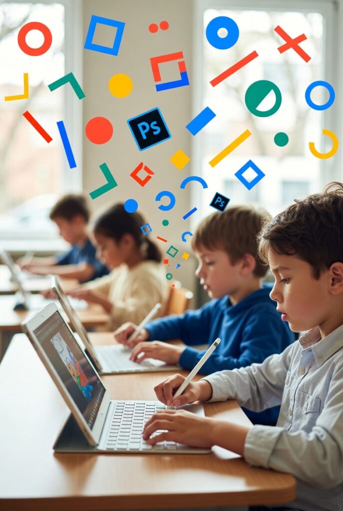 Tworzenie kompozycji, edycja kolorów i kształtów . Kursy rozwijają kreatywność, koncentrację, współpracę i cyfrową literację, co pomaga w szkole i życiu codziennym. Badania pokazują, że nauka sztuki cyfrowej poprawia wyniki w matematyce i logice.